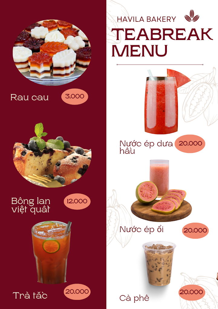 - Thực đơn đa dạng và hấp dẫn: Havila Bakery tự hào sở hữu đội ngũ nhân viên tài năng và giàu kinh nghiệm, luôn cập nhật những xu hướng Tea Break mới nhất để mang đến một menu tiệc teabreak Bình Dương vô cùng phong phú và đa dạng. Quý khách hàng có thể thoải mái lựa chọn từ những loại bánh ngọt thủ công tinh tế, bánh mặn thơm ngon, trái cây tươi theo mùa được tuyển chọn kỹ lưỡng, đến các loại nước ép trái cây tươi mát, trà hảo hạng và cà phê đậm đà. Đặc biệt, Havila Bakery luôn đặt chất lượng nguyên liệu lên hàng đầu, cam kết sử dụng những sản phẩm tươi ngon, an toàn vệ sinh thực phẩm để tạo nên hương vị đặc trưng và khó quên trong từng món ăn.