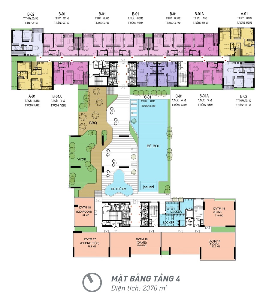 - Cung cấp 910 căn hộ từ 1 - 3 phòng ngủ và 18 căn dịch vụ thương mại. Mỗi căn hộ có diện tích sàn sử dụng bao gồm: