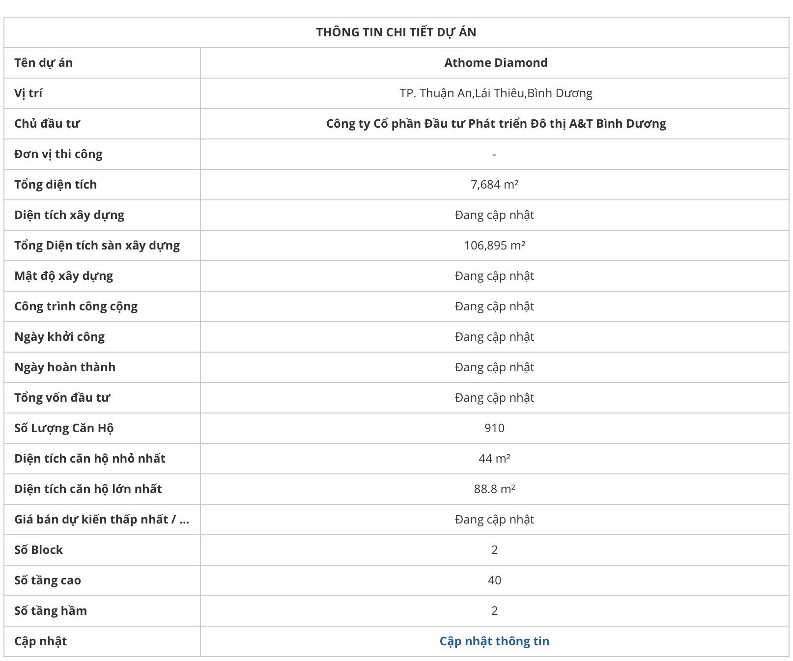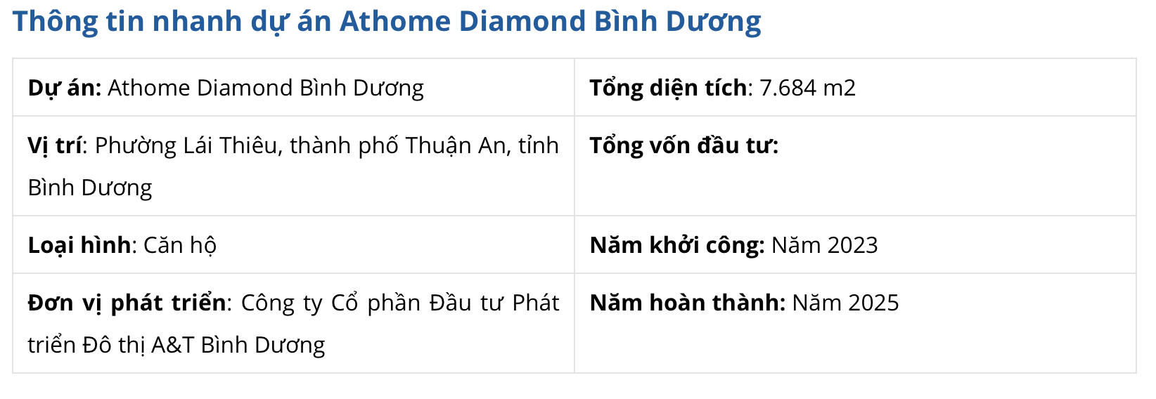 - Dự án căn hộ chung cư Athome Diamond - Thành phố Thuận An dự kiến triển khai từ năm 2023 đến năm 2025. Sản phẩm sẽ được ra mắt thị trường trong thời gian sắp tới.